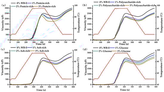 The influence of major components in WB-E on the pasting characteristics of starch. (a–d) were pasting viscosity curves with varying contents of protein-rich, polysaccharide-rich, ash-rich and glucose fractions, respectively. The red line in each graph represents the temperature profile, reflecting the programmed heating and cooling phases during the measurement.