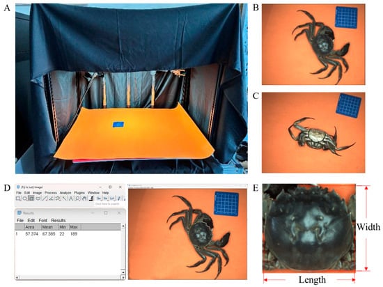 The crabs’ sex was identified through the observation of experienced technicians, and the carapace’s length and width were measured using a vernier caliper. ImageJ software (ver.1.54) was utilized to extract the carapace area. The carapace region, identified as the region of interest (ROI), was manually labeled (Figure 2D). The pixel count within the contour region was determined (Figure 2E). The actual carapace area in cm2 was calculated using a standard calibration card included in the image.