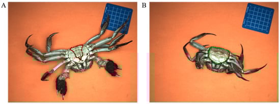 To minimize the optical interference from ambient lighting and background variability [31,32], the imaging chamber was isolated using light-absorbing black fabric enclosures. Uniform illumination was achieved through a triangular configuration of LED panels (5000 K color temperature) comprising three overhead flanking units above the imaging platform, ensuring consistent spectral distribution across the measurement area. The industrial RGB camera was vertically positioned at an optimal height of 38.5 cm above the measurement platform to acquire the best vision field for carapace imaging. The system underwent calibration checks. A reference scale board was kept within the vision field together with each sample imaging for calibration to maintain measurement accuracy and ensure consistent image quality, as shown in Figure 2. When imaging, each crab was wiped carefully with paper towels to keep the carapace surface dry and clean. Each sample was photographed twice, capturing one dorsal view image (Figure 2B) and one ventral image (Figure 2C), respectively; there was thus a collection of 764 raw images for the image library.
