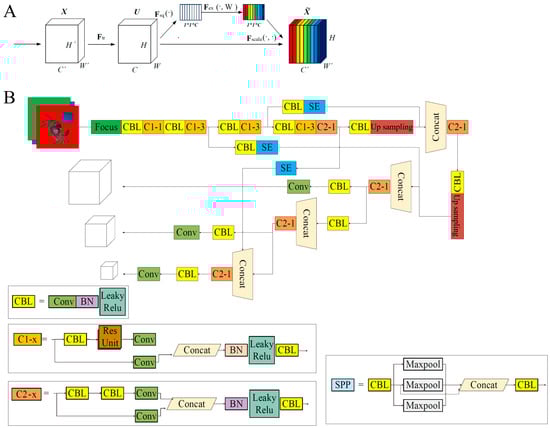 The SE attention mechanism improves model efficiency by learning adaptive channel-wise weights, allowing the model to focus more on informative feature channels [34]. As illustrated in Figure 4A, the structure operates as follows. First, a squeeze operation performs global pooling on each feature map, compressing it into a 1 × 1 × C descriptor (Figure 4A). Subsequently, an excitation operation learns channel-specific weights to adaptively recalibrate feature channel importance. Notably, this module preserves the spatial dimensions of input feature maps while enhancing channel-wise discriminative power. The resultant network structure of YOLOv5-seg+SE is shown in Figure 4B. Briefly, the network begins with a Focus layer and CBL blocks (Conv-BN-LeakyReLU) for down-sampling and feature extraction. SE modules dynamically recalibrate channel weights to emphasize informative features. The segmentation head employs up-sampling, concat operations, and SPP (Spatial Pyramid Pooling) to merge multi-scale context information for precise mask prediction. Key components such as residual connections (C2_x, Res Unit) and hierarchical design ensure efficiency and accuracy, which makes them suitable for the tasks in this study, such as crab integrity detection. The architecture balances detection and segmentation by optimizing both spatial and channel-wise features.