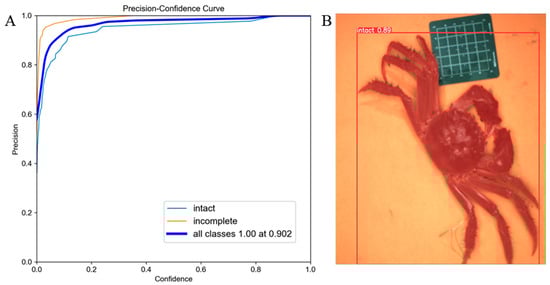 Integrity identification of Chinese mitten crab. (A) Precision-confidence curve of the sex identification model. (B) Integrity identification.