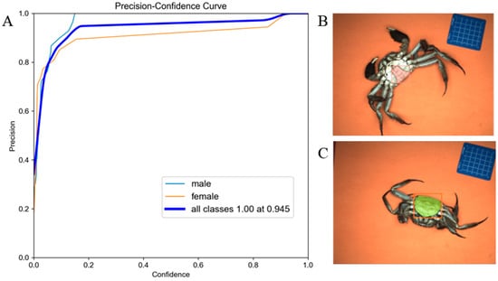 The performance of sex discrimination model of Chinese mitten crab. (A) Precision-confidence curve of the sex identification model. (B) Male recognition. (C) Female recognition.
