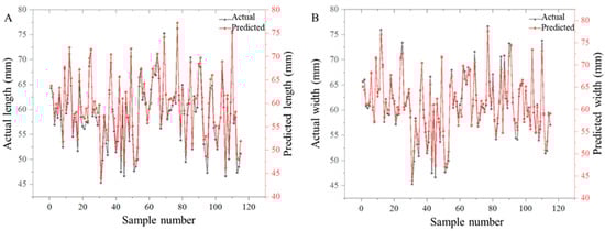 Performance of carapace size extraction. (A) Performance of carapace length prediction; (B) performance of carapace width prediction.