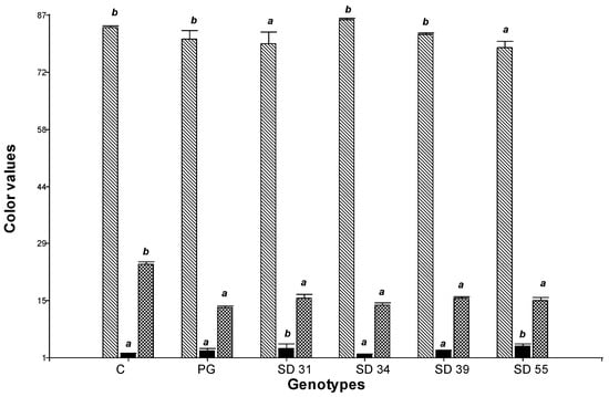. C: control durum wheat, PG: Prointa Gaucho. Different letters on bars corresponding to the same color parameter (L*, a*, or b*) indicate significant differences among genotypes (p < 0.05).