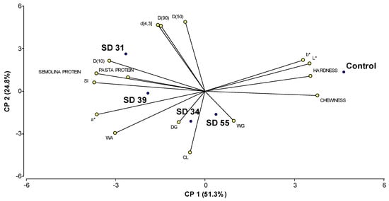 Biplot of Principal Component Analysis of the analyzed wheats (control durum wheats and modified hexaploid wheats). The points represent the cultivars, and the rays correspond to the evaluated characteristics (L*, a*, b* (color values); D(10), D(50), D(90) and d[4,3] (particle size distribution parameters); WG: wet gluten; DG: dry gluten, SI: swelling index; WA: water absorption; CL: cooking loss).