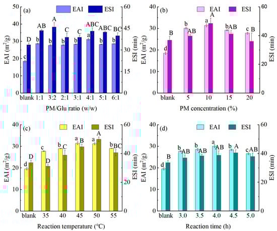 - Gao, K.; Xu, Y.; Rao, J.; Chen, B. Maillard reaction between high-intensity ultrasound pre-treated pea protein isolate and glucose: Impact of reaction time and pH on the conjugation process and the properties of conjugates. Food Chem. 2024, 434, 137486. [Google Scholar] [CrossRef] [PubMed]