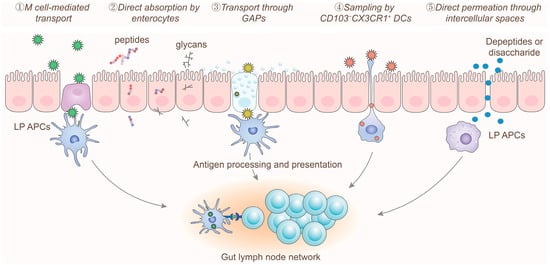 After digestion and degradation, food allergens that reach the small intestine can be recognized and presented to the immune system through several mechanisms (Figure 1) [26,27,28]: (1) M cell-mediated transport: Soluble protein aggregates are initially processed, absorbed, and transported by M cells located in the follicle-associated epithelium. Subsequently, these antigens are recognized and presented to the immune system by antigen-presenting cells (APCs) within the lymphoid follicles. (2) Direct absorption by enterocytes: Amino acids, oligopeptides, and glycans with molecular weights less than 1500 Da can be directly absorbed and utilized by enterocytes for transport. (3) Goblet cell-associated antigen passage: Soluble protein particles and peptides can be absorbed and transported to the basal layer via GAPs. These antigens are then recognized, processed, and presented to naïve T cells and antigen-specific regulatory T cells (Tregs) by CD103+ DCs, which are essential for maintaining the immune activity of intestinal Tregs [29,30]. (4) Sampling by CD103−CX3CR1+ DCs: CD103−CX3CR1+ DCs located beneath the intestinal epithelium form trans-epithelial dendrites that actively sample low molecular weight protein particles and microbial antigens from the intestinal lumen, thereby maintaining tolerance to commensal bacteria and certain water-soluble antigens [31]. (5) Direct permeation through intercellular spaces: Some amino acids and peptides with molecular weights less than 600 Da can directly permeate through intercellular spaces into the subepithelial region, from where they are transported by blood vessels and lymphatic vessels.