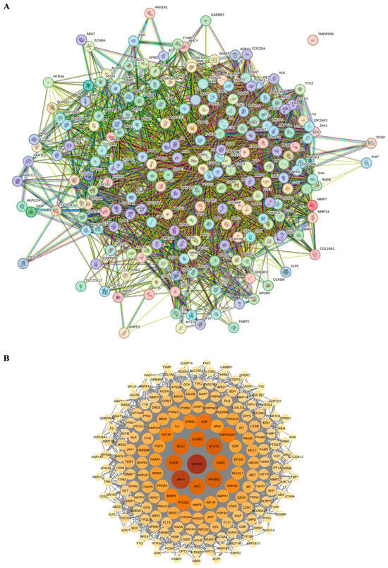 Identification of the key targets of bioactive components derived from GE against alcoholic liver injury. (A) The PPI network diagram was constructed using the STRING database. (B) The core targets was identified by using Cytoscape software. Nodes indicate targets proteins, while edges represent the connections between target proteins. Larger and darker red nodes represent more important target proteins in the network.
