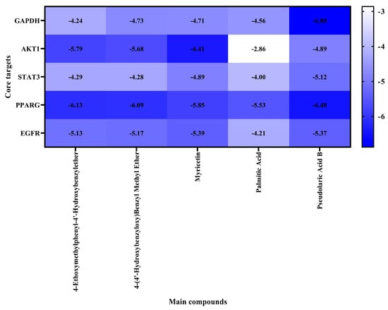 The heatmap of binding energies between the main bioactive components of GE and the key targets associated with alcoholic liver injury. Darker blue rectangles represent lower binding energy scores for docking of ligands to target proteins.