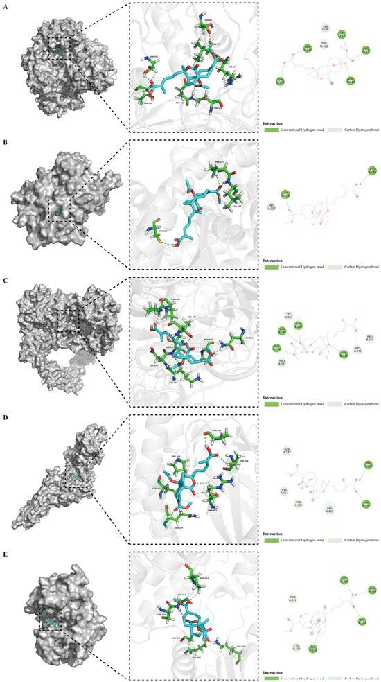 Subsequently, we utilized Pymol and DiscoveryStudio software to visualize and analyze 3D and 2D models of pseudolaric acid B interaction with the key targets, as shown in Figure 5. Pseudolaric acid B docked to the binding pocket of the five key target proteins. Furthermore, in these docking models, pseudolaric acid B formed hydrogen bonds with several key residues in the target proteins. Specifically, in GAPDH, it interacted with ARG-13, ILE-14, SER-98, SER-151, THR-153, THR-182, and ASN-316. In PPARG, the interacting residues were PRO-227, LEU-228, and CYS-285. In EGFR, the key residues included LYS-237, ASP-238, THR-239, PRO-241, PRO-242, and ASN-256. In STAT3, it formed bonds with GLN-247, CYS-251, ARG-325, PRO-330, PRO-336, and THR-346. In AKT1, the residues involved were LYS-179, GLU-198, GLY-294, CYS-310, GLY-311, and PRO-313. These results suggest that pseudolaric acid B could interact with these key targets of alcoholic liver injury, further verifying the accuracy of our above results.