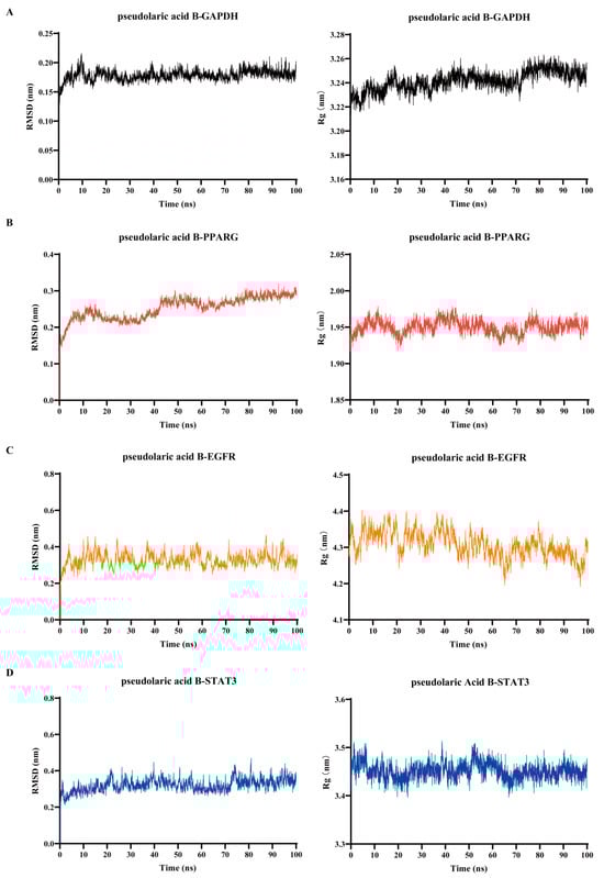 Molecular dynamics simulations of pseudolaric acid B interacted with the key target proteins for 100 ns. (A) The RMSD and Rg plots for the complex of pseudolaric acid B interacted with GAPDH. (B) The RMSD and Rg plots for the complex of pseudolaric acid B interacted with PPARG. (C) The RMSD and Rg plots for the complex of pseudolaric acid B interacted with EGFR. (D) The RMSD and Rg plots for the complex of pseudolaric acid B interacted with STAT3.