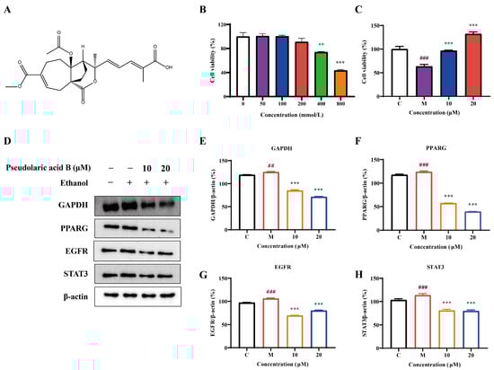 The effect of pseudolaric acid B on the amelioration of alcoholic liver injury in HepG2 cells. (A) The chemical structure of pseudolaric acid B. (B) The effect of different concentrations of ethanol on HepG2 cell viability. (C) Effect of different concentrations of pseudolaric acid B on cell viability in ethanol-induced HepG2 cell injury. (D) Western blot assay, conducted to detect the effect of pseudolaric acid B on the expression of the key target proteins. (E–H) Quantification of the expression levels of GAPDH, PPARG, EGFR, and STAT3. All data represent the average of three independent experiments (mean ± SEM). ## p < 0.01, ### p < 0.001 vs. the control; ** p < 0.01, *** p < 0.001 vs. the model.