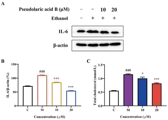 Alcoholic liver injury induces the release of a substantial amount of inflammatory cytokines from hepatic cells. To further verify the preventive effect of pseudolaric acid B on alcoholic liver injury, we assessed its impact on downstream inflammatory cytokines. As shown in Figure 8A,B, after treatment with 10 μM and 20 μM of pseudolaric acid B, the expression of IL-6 was significantly suppressed compared with the model group. Moreover, the levels of total cholesterol (TC) are correlated with the degree of liver injury. As liver injury progresses, the capacity of liver to synthesize and metabolize cholesterol is further impaired, potentially leading to an increase in TC levels. As shown in Figure 8C, pseudolaric acid B significantly reduced the TC content in HepG2 cells, thereby maintaining normal lipid metabolism. In conjunction with our previous findings, these results further demonstrate that pseudolaric acid B, as a core component of GE, exhibits preventive effects against alcoholic liver injury.