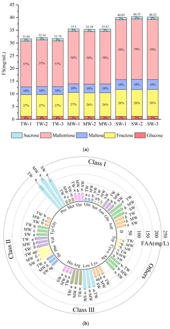 Stacked bar chart of FSs in wort (a) and circumplex of FAAs in wort (b). FS: fermentable sugar; FAA: free amino acid; TW: two-row malt wort; MW: equally mixed two-row malt and six-row malt wort; SW: six-row malt wort. a–c indicated significant differences between values at p < 0.05.