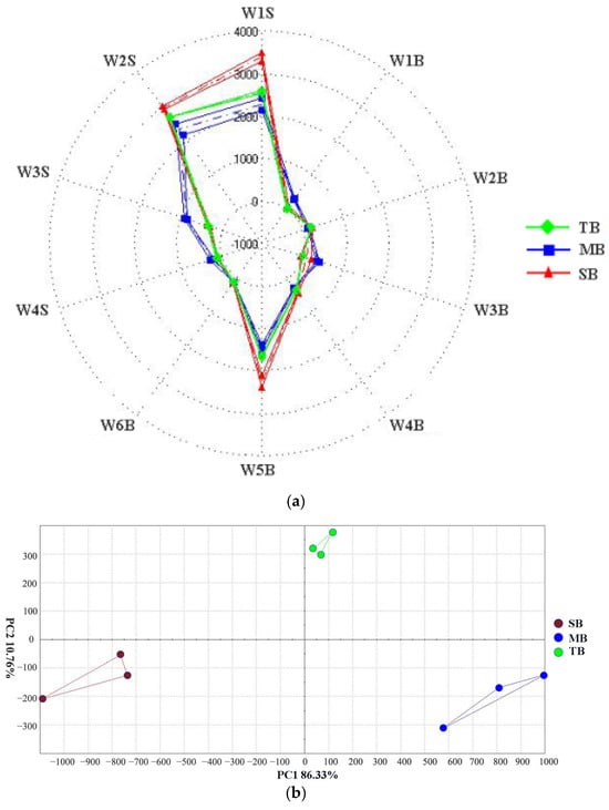 The GC-E-nose integrates the functions of GC and E-nose, which enables an objective and fast analysis of the aroma substances of different samples by simulating human senses []. Two-row malt beer (TB), mixed malt beer (MB), and six-row malt beer (SB) beers were analyzed by GC-E-nose. PCA plots and radar plots were constructed from the GC-E-nose data, as shown in Figure 2.
