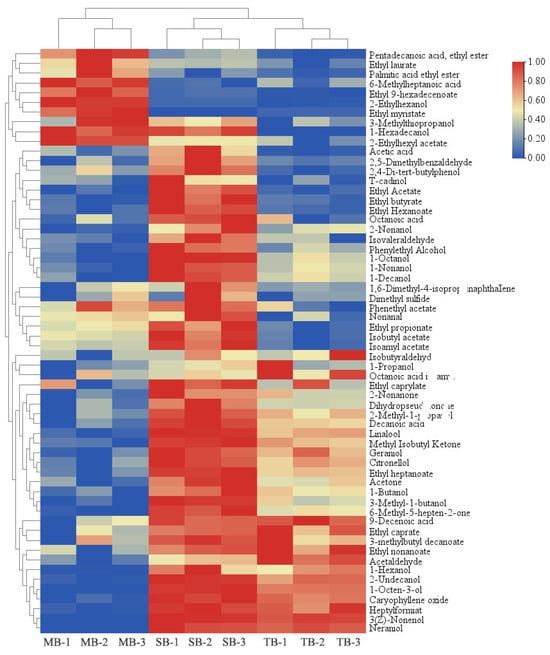 Flavor heatmap of different beer samples based on GC-MS. TB: two-row malt beer; MB: mixed malt beer; SB: six-row malt beer.