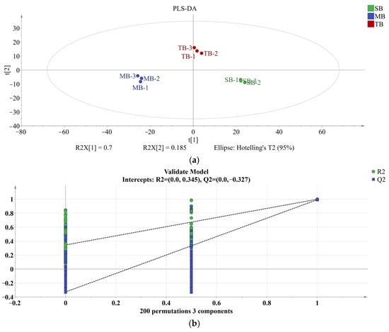 To further reveal the effect of malt with different row-types on beer’s VCs, the differences between beer’s volatiles were analyzed by PLS-DA. PLS-DA, a multi-class discriminant classifier that uses sample variability to delineate boundaries between categories, has become one of the most commonly used discriminant techniques in the field of beer []. As shown in Figure 4a, the model had R2X = 0.973, R2Y = 0.991, and Q2 > 0.9, which indicated that the model was highly reliable. The intercept of the regression line on the Y-axis for the predicted values of Q2 after the 200 permutation tests was less than 0 (Figure 4b), indicating that the model was not overfitted. TB, MB, and SB were located in quadrants 1, 3, and 4, respectively, indicating that there were significant differences in the VCs of all three beers, which was in agreement with the results of the GC-E-nose, and the flavor heatmap analyses.