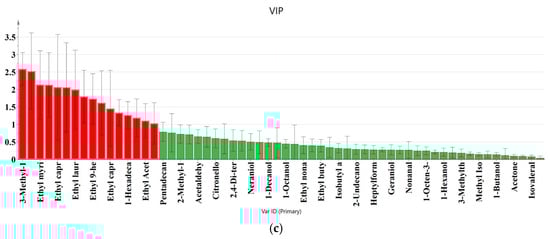 Partial least squares discriminant analysis (PLS-DA) of volatile compounds (VCs) in the three types of beer samples. Score scatter plot for the PLS-DA model (a); Permutation test (b) for the validation of the PLS-DA model; variables’ importance in projection (VIP) plots of PLS-DA model variables (c); the red color in the graph indicates that the VIP > 1.