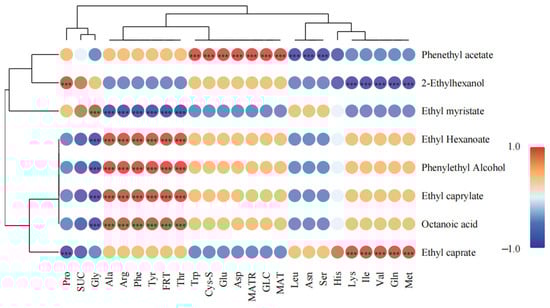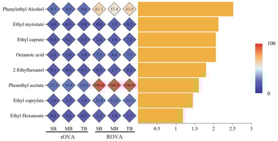 The variables’ importance in projection (VIP) score quantified the contribution of each compound to the model classification of the samples, and compounds with VIP > 1 played a key role in the classification of the samples []. Sixteen key differentially VCs were screened based on VIP > 1 (Figure 4c), including 3-methyl-1-butanol (VIP: 2.58), 2-ethylhexanol (VIP: 1.80), phenylethyl alcohol (VIP: 2.52), 1-hexadecanol (VIP: 1.27), ethyl acetate (VIP: 1.11), isoamyl acetate (VIP: 2.13), ethyl hexanoate (VIP: 1.19), ethyl caprylate (VIP: 1.45), ethyl caprate (VIP: 2.06), phenethyl acetate (VIP: 1.61), ethyl laurate (VIP: 1.99), palmitic acid ethyl ester (VIP: 1.03), ethyl 9-hexadecenoate (VIP: 1.73), ethyl myristate (VIP: 2.13), octanoic acid (VIP: 2.05), and decanoic acid (VIP: 1.33). Thus, the different row-types of malt affect the flavor of the beer mainly by influencing the content of these 16 compounds. However, further systematic analysis of the VCs was required to fully quantify and assess the contribution of each volatile compound to the overall beer’s VCs.