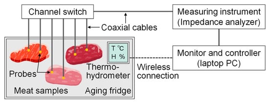 The electrical properties of meat are known to change with protein degradation and changes in water content as aging progresses [16,24], and it may be possible to evaluate meat quality by inputting electromagnetic waves using a probe that contacts or punctures the meat and measuring the response. Figure 1 shows the electromagnetic response measurement system used during meat aging proposed in this study. The system consists of an aging fridge, a thermo-hygrometer, probes, coaxial cables, a channel switch, and an electromagnetic response measuring instrument.