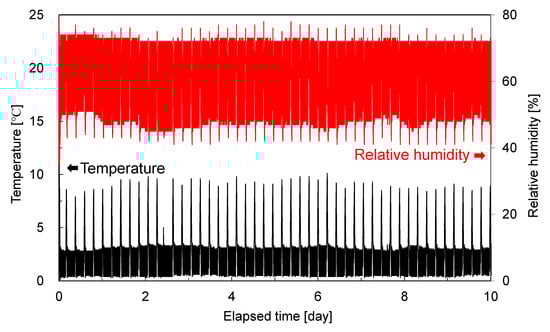 We measured the internal temperature and humidity characteristics of the fridge using a wireless thermo-hygrometer (T&D Corporation, TR-72wb, Matsumoto, Nagano, Japan) and found that they remained stable within the optimal range for aging, as shown in Figure 2. The temperature, recorded at 10 min intervals, averaged 2.6 °C (standard deviation of 0.8 °C), and the relative humidity averaged 64% (standard deviation of 4%), both remaining within the recommended range for dry aging (0–4 °C and 60–80%). The spatial variation in temperature and humidity inside the fridge was within ±0.2 °C and ±2% RH, confirming sufficient environmental uniformity. The internal lighting contained no ultraviolet components and does not influence the meat temperature. Additionally, a transient rise in temperature and drop in humidity observed approximately every 12 h were due to defrosting cycles; after each cycle, conditions quickly returned to the set points, confirming that electromagnetic measurements can be carried out under a stable environment with minimal disturbance.