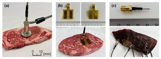 In the proposed meat aging system, a measurement probe that attaches directly to the meat is required. The authors previously investigated and developed electromagnetic phantoms that replicate the electrical properties of biological tissues such as muscle, fat, and skin, as well as probes for measuring their properties [25,26,27,28]. Figure 3a–c show representative probe types, and Table 1 summarizes their characteristics. The open-ended coaxial probe is mainly used for dielectric measurements at high frequencies, from a few hundred MHz to tens of GHz, and it is well-studied and easy to apply [29,30,31]. However, as it is designed for dielectric measurements, it is extremely expensive. Furthermore, it is difficult to measure the internal state of the meat due to the shallow sensing depth inherent to the open-ended coaxial method.