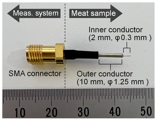 To enable stable internal measurements of meat by puncture in this study, we prototyped a puncture-type semi-rigid coaxial probe, as shown in Figure 4. Because this probe has a semi-rigid coaxial structure, it can be used stably over an extremely wide frequency range (from a few kHz to several GHz), and being puncture-type, it can measure the internal state of the meat and, thanks to a stable interface, is suitable for long-term measurement. Moreover, since it uses a general semi-rigid coaxial design, it can be manufactured inexpensively in large quantities. In the probe’s puncture section, the inner conductor protrudes by 2 mm and the outer conductor by 10 mm, leaving a 2 mm dielectric gap between them. The materials of the probe are as follows: the inner conductor is silver plated copper clad steel wire, the outer conductor is a tin plated copper tube, and the dielectric is solid polytetrafluoroethylene. The diameters of the puncture tip are approximately 0.3 mm for the inner conductor and 1.25 mm for the outer conductor, which are very small, enabling measurements that are almost non-destructive. When this probe is inserted into meat, a high-frequency electromagnetic field is generated between the inner and outer conductors, and the response varies according to the state of the meat.