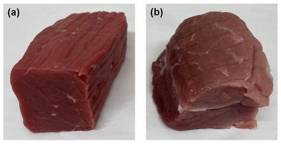 Figure 5a,b show the meat samples used to evaluate the electromagnetic response measurement system; their details are given in Table 2. Two types of meat samples were prepared: (a) a block of beef round and (b) a block of pork leg. Both meat samples were purchased from local supermarkets and used in the experiments shortly after purchase. Sample (a) is predominantly lean with very little marbling, corresponding to a marbling grade of 1 (lowest) on the Japanese beef marbling standard (12-grade scale) [34]. Sample (b) is also mostly lean and similarly has almost no marbling. This study focused on the development and evaluation of a meat electromagnetic response monitoring system. To accelerate the aging process via higher water activity and enzymatic activity, lean meat with low marbling was selected as the sample. Each meat sample was trimmed to approximately 60 × 60 × 100 mm3 for the experiments. The weights of the trimmed samples were 314 g for (a) and 294 g for (b).