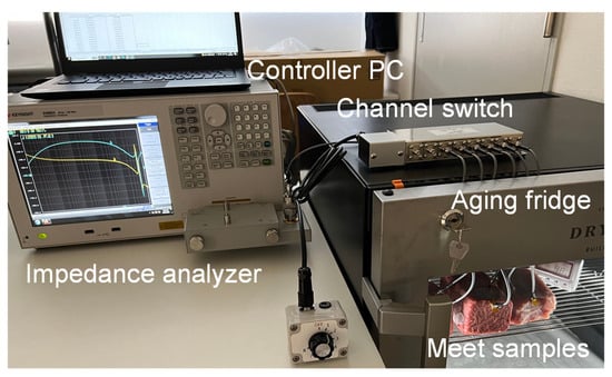 Thus, while attempts to evaluate meat quality through electrical characteristics have attracted significant attention, most previous studies have been limited to assessing specific parameters such as fat or water content. Another major issue is that few discussions have addressed the measurement environment (temperature, humidity) of the meat or the temporal changes that occur during measurement. In many prior studies, samples were taken out of the aging environment at set intervals for measurements in a laboratory, and fluctuations in temperature/humidity or probe repositioning for each measurement could greatly affect the results [23]. Moreover, the environmental conditions change with each measurement when measurements are performed outside of the aging fridge, making it difficult to strictly separate meat quality changes due to aging from the effects of environmental factors. In other words, no study has yet evaluated the electromagnetic response characteristics of meat over the long term in a stable manner while maintaining conditions suitable for aging (e.g., appropriate temperature, humidity, and hygiene). In this study, we developed a system capable of multi-faceted and detailed measurement of the electromagnetic response characteristics during meat aging and verified its basic performance using two types of meat samples (beef and pork).