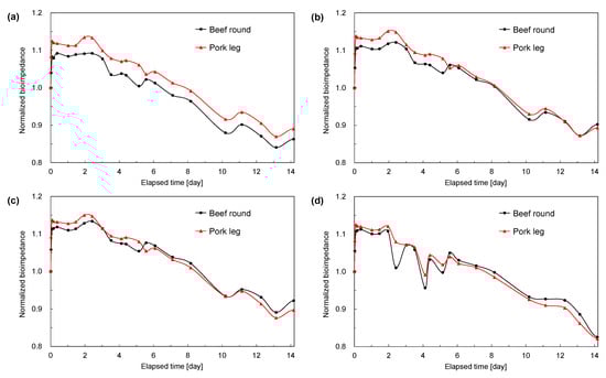 Bioimpedance of meat samples as a function of elapsed time (day). (a) 10 kHz; (b) 100 kHz; (c) 1 MHz; (d) 10 MHz.