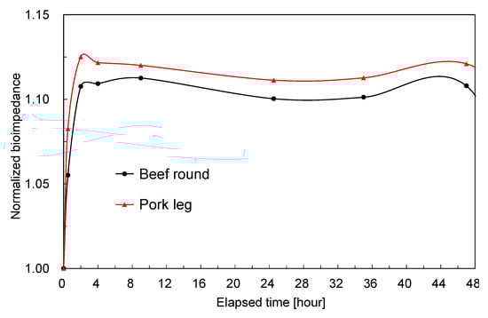 As shown in Figure 7, for all meat samples at all measured frequencies, the bioimpedance increased sharply just after the start of measurement. To illustrate this transient increase in more detail, Figure 8 shows the bioimpedance at 10 MHz, focusing on the first 48 h of measurement. Because this fluctuation occurs over only a few hours, it is not attributable to enzymatic autolysis within the meat (aging effect) or changes in water content; rather, it is thought to result from the instability of the interface between the probe and the meat immediately after insertion. Once a metal electrode contacts an electrolyte, bioimpedance measurements exhibit substantial drift in electrode potential and impedance during the first few tens of minutes due to active charge redistribution and double-layer formation at the electrode–tissue interface. These interfacial phenomena typically converge over tens of minutes to a few hours, after which electrode potential and impedance stabilize. The rapid bioimpedance changes observed at the start of our measurements can therefore be ascribed to these electrode potential fluctuations [51,52,53].