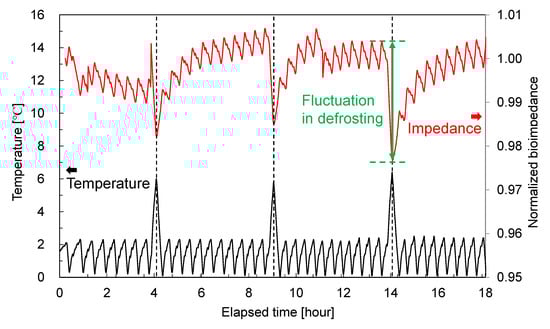 In the 10 MHz results shown in Figure 7d, distinctive drops in bioimpedance were observed on days 2, 4, and 5 that did not appear at the other frequencies. These changes deviate from the long-term aging trends and occurred at the same time for both meat samples; therefore, we considered that some disturbance in the aging fridge at those times caused short-term fluctuations in bioimpedance, and we conducted high-time-resolution measurements to investigate this effect. A probe was inserted into another round beef sample of a similar size (same dimensions as in Figure 5), and the bioimpedance at 10 MHz was measured at 1 m intervals for 18 h, along with monitoring the fridge temperature; the results are shown in Figure 9. We confirmed that the temperature changes were due to the fridge’s defrosting function. From Figure 9, it is evident that the timing of temperature increases in the fridge coincides with drops in bioimpedance; in other words, the short-term bioimpedance fluctuations were caused by changes in chamber temperature and humidity due to defrosting and the associated reversible changes in the meat’s state. This is presumed to be the cause of the characteristic bioimpedance dips observed in Figure 7d. Therefore, when taking measurements, it is advisable to use frequencies below 1 MHz, which are less affected by temperature changes, or to avoid taking measurements during defrost cycles. Furthermore, for practical aging monitoring, using a low-frequency band (below 1 MHz) and supplementing it with a high-frequency band, such as 10 MHz, to detect environmental fluctuations or apply temperature/humidity corrections could enable the evaluation of meat aging with reduced interference.