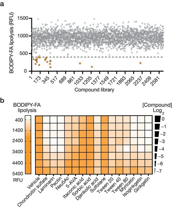 High-throughput screening of food-derived compounds for inhibition of lipolysis in frozen human milk. (a) Food-derived compounds screened for breastmilk lipolysis inhibition. Orange dots indicate compounds reducing lipolysis below the threshold (dashed line); gray dots show inactive compounds. Data represent the initial HTS readouts. (b) Validation of selected hit compounds from panel (a). The heatmap displays lipolysis inhibition in relative fluorescent units (RFU) at different compound concentrations. Compound concentrations are expressed as dilutions (Log2(0) to Log2(−7)) of the screening library stock solutions. Ne5Ac: N-Acetylneuraminic acid; 5-AVA: 5-Aminovaleric acid. Significant differences were observed across treatments and time points (p < 0.0001), indicating that these compounds influence milk lipolysis dynamics during freezer storage. Data represent the median of three independent replicates.