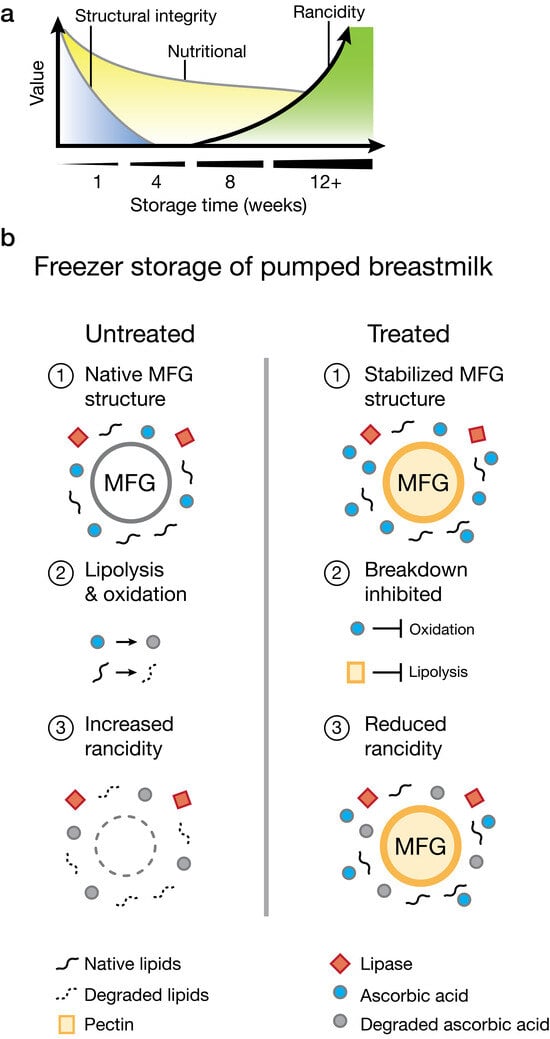 Changes in breastmilk quality during storage and the protective effects of ascorbic acid and pectin treatment. (a) Model depicting changes in human milk quality over storage time. At 1 week, degradation begins, leading to a decline in both nutritional value and structural integrity. Between 8 and 12 weeks, rancidification accelerates, marked by an increase in FFAs and other breakdown products, which further reduce nutritional quality and structural integrity. Rancidity continues to rise beyond 12 weeks. (b) Schematic model illustrating biochemical and structural changes that occur in human milk during storage. Untreated milk, left: Storage compromises MFG structure, enabling lipase-mediated fat hydrolysis and degradation. Lipolysis of triglycerides and lipid oxidation produces secondary and tertiary products that cause rancidity. Treated milk, right (model proposed in the current work): Pectin preserves MFG structural integrity, limiting lipase access to MFGs. Ascorbic acid provides protection from oxidation. Together, these two mechanisms suppress rancidification.