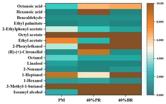A heat map (Figure 1) was constructed for the 16 compounds present in three beers. The brown colour represents the highest standard concentration of each substance, while the blue colour denotes the lowest standard concentration. Compared with PM beer (1.828 mg/L), 40% PR and 40% BR beers had higher levels of isoamyl alcohol (19.52 and 21.311 mg/L). Isoamyl alcohol can bring a strong alcohol aroma to beer, which is the main cause of human drunkenness []. In another study on rice beer, isoamyl alcohol also showed a high content []. The contents of 2-phenylethanol in 40% PR and 40% BR beers (22.426 and 22.976 mg/L) were higher than in PM beer (17.226 mg/L), which can impart strong rose, phenol, and smoky aromas to beer. In another study, 2-phenylethanol was also considered the major compound in the volatile substances of rice beer []. Ethyl acetate showed higher content in 40% BR beer (11.892 mg/L), contributing to a fruity aroma and enriching the beer body, which has also been identified in other beers related to rice []. Octanoic acid contents in 40% PR and 40% BR beer (6.512 and 6.801 mg/L) were significantly higher than in PM beer (0.0051 mg/L). It is a common fatty acid, and the existing literature has reported that an excessive amount of fatty acids is detrimental to beer aroma [].