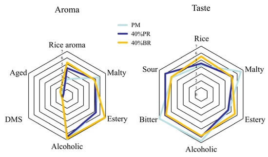 The sensory analysis results for the three beer samples are presented in Figure 2. The three beers received low scores for aged and DMS aroma, suggestive of their freshness and lack of off-flavours. PM beer exhibited a strong malty aroma, while both 40% BR and 40% PR beer displayed a rice aroma, with the former showing a more prominent presence. Moreover, the 40% BR beer demonstrated heightened estery and alcoholic aromas compared to the others. With regard to taste, PM beer exhibited a pronounced malty taste, whereas the 40% BR beer featured a rich rice taste and a fruity ester-like taste. This is in accordance with aroma. Mayer et al. also noted an increase in fruity flavours in rice malt beer []. PM resulted in beer with the highest score for bitterness. The addition of rice neutralized the bitter taste, enhancing the beer’s overall drinkability. Although there was no statistically significant difference in bitterness (Table 3), the brewing industry widely acknowledges that the distinct bitterness profiles of beers stem from various factors beyond the conventional analytical metric of bitterness units [].