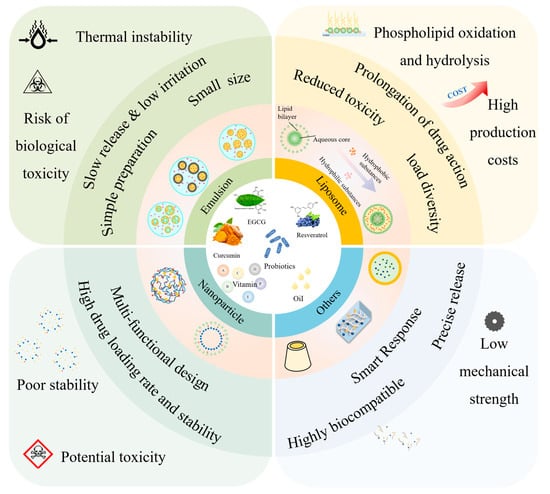 With the rapid development of food technology and the continuous increase in consumption level, people are paying more attention to daily dietary health as well as disease prevention, and the demand for functional foods is increasing. This significant shift reflects the consumer’s strong demand for disease prevention through daily dietary interventions. Bioactive substances, such as polyphenols, drugs, vitamins, and proteins, not only have anti-inflammatory and antioxidant abilities and the ability to regulate intestinal flora [1], but also have a variety of pharmacological effects, such as anticancer, anticardiovascular disease, anti-obesity, anti-aging, and immune regulation effects [2,3], which play an important role in functional foods. However, these bioactives face many challenges in practical applications. Low water solubility (lipid-soluble nutrients) or environmental sensitivity (UV, pH, heat, gastrointestinal) can lead to reduced stability or even loss of bioactivity, which ultimately affects their absorption and utilization by the human body and reduces bioavailability [4,5,6,7]. To overcome these limitations, encapsulation technology has emerged as an effective solution. Currently, researchers have developed a variety of delivery systems, such as emulsions, nanoparticles, hydrogels, microcapsules, and nanoliposomes, for loading various functional ingredients. These delivery systems are capable of protecting bioactives from damage by external factors during food storage, processing, and in the gastrointestinal tract [8].