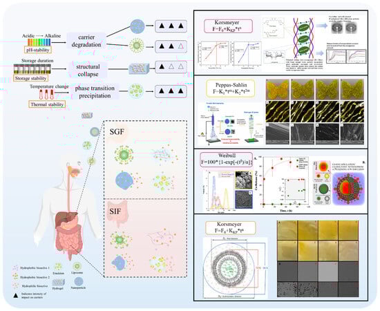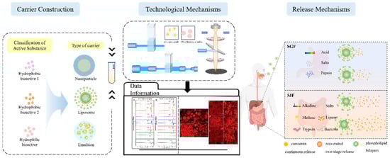 Figure 4 plots the process from the carrier construction–technological mechanism to the release mechanism. The rate of release of nanoparticles is influenced by factors such as their particle size, surface properties, and solubility of the substance. Smaller particle sizes usually contribute to faster release, often consistent with zero- or first-level kinetics. And when liposomes released two bioactives simultaneously, the researchers found that the Korsmeyer–Peppas model was more in line with the release characteristics of the bioactives, which are dominated by Fickian diffusion [189]. In addition, liposomes can protect the active substances from degradation during the gastric digestion stage to a certain extent, and successfully release and absorb them during the intestinal digestion process. The crosslink density and network structure of hydrogels have a significant effect on drug release, which is more in line with the Higuchi equation or the Korsmeyer–Peppas equation. Hydrogels with high crosslink density usually have slower drug release rates [198]. However, the Weibull model can fit perfectly with the controlled release profiles of all bioactive substances, mainly due to the use of the spray drying technique. The significant differences in the release kinetics of different bioactive substances in the hydrogel system may be related to the magnitude of the molecular weight of the actives and the differences in the binding force between the bioactive substances and the hydrophilic gel matrix. In addition, although single active substance delivery systems can achieve stable controlled release, they cannot fully utilize the synergistic effect of multiple components. In contrast, the co-delivery system has significant synergistic effects, but the compatibility of multiple components needs to be solved, and the carrier material needs to take into account the physicochemical properties of different components. To optimize the delivery system, microfluidic technology can be used to enhance the batch consistency of nanocarriers and avoid the problem of uneven particle size distribution in the traditional process. In addition, the establishment of an in vitro–in vivo correlation model can effectively reduce experimental errors and improve the reliability of this study. However, there are still shortcomings in the existing technologies. For example, the chemical stability and release competition mechanism between components in the co-embedding system need to be further analyzed. In addition, individualized carrier design based on multi-omics data is still in the preliminary stage and is not yet mature. Future research directions can be optimized by optimizing the carrier materials, improving the preparation process, and studying the release mechanism in depth, which is expected to promote the clinical application of precision drug and nutrient delivery systems and provide more efficient technical support for personalized medicine.