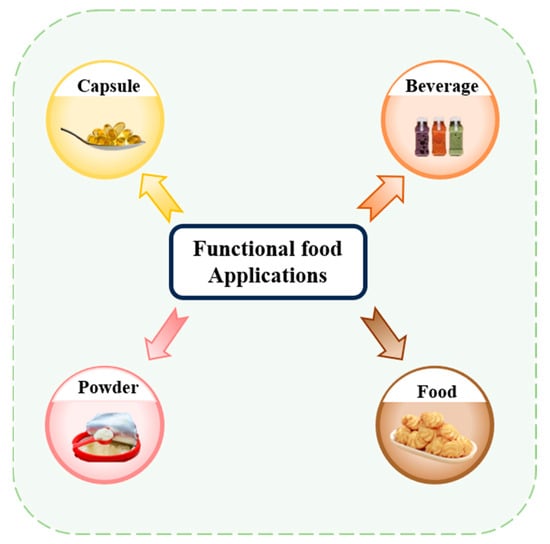 With the rapid growth of food technology and consumption levels, the demand for functional foods has increased. Compared to functional foods with a single active substance, functional foods with multiple active substances co-delivered in one system have received widespread attention. Due to the synergistic effect of the co-delivery system on the bioactivity of the active substances, multiple bioactivities are exerted, which provide excellent health benefits and wellness effects. Functional foods are closely related to precision nutrition, which refers to the optimization of health and the prevention, management, and treatment of disease through personalized nutritional support during nutritional interventions, and is also a consideration in the design of co-delivery vehicles [69]. Therefore, researchers and scholars have developed many application systems containing co-delivery carriers for active substances. In the current research, common delivery vehicles mainly include emulsions, nanoliposomes, nanoparticles, gels (hydrogels, oleogels, and emulsion gels), and microcapsules. Based on the encapsulation of multiple active substances (polyphenols, vitamins, bacteria, and proteins, etc.) by co-delivery vehicles, bioactive synergism can be used in a wide range of applications. In addition to this, the specificity of the co-delivery vehicle itself provides the basis for its application. Currently, the common applications of co-delivery systems are mainly in the field of food (Figure 5) [199,200,201,202,203,204,205,206,207].
