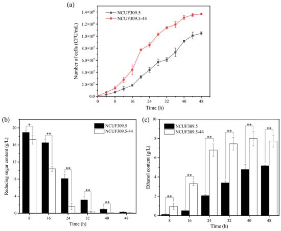 The growth curves of S. cerevisiae NCUF309.5-44 and the original strain NCUF309.5 under 4% lactic acid were depicted in Figure 1a. As the incubation time increased, the cell number of both strains also increased. However, the cell number of S. cerevisiae NCUF309.5-44 was significantly higher than that of S. cerevisiae NCUF309.5. After 16 h of cultivation, the cell counts of the lactic acid-tolerant strain increased by approximately 2.41 times compared to the original strain, indicating that S. cerevisiae NCUF309.5-44 was indeed superior to the original strain. Additionally, the utilization of reducing sugars and the ethanol production capacity of the S. cerevisiae NCUF309.5-44 were significantly enhanced (Figure 1b,c). The ethanol content of the lactic acid-tolerant strain was 6.43 times higher than the original strain at 16 h, indicating that S. cerevisiae NCUF309.5-44 could elevate sugar metabolism efficiency to produce more energy in response to lactic acid stress, and it was capable of producing more ethanol. These results demonstrated the application prospects of S. cerevisiae NCUF309.5-44 in Jiupei with high concentration lactic acid and its potential for industrial application in Baijiu production. Further optimization and scale-up trials are ongoing to fully harness the potential of S. cerevisiae NCUF309.5-44 for commercial Baijiu production.