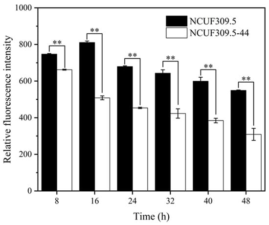 ROS are byproducts generated by yeast cells during their own aerobic metabolism when a portion of the oxygen cannot be completely reduced. Once faced with various external stress factors, the concentration of ROS increases, which may then damage key biomolecules in yeast cells, including proteins, DNA, and lipids, leading to cellular damage [20]. To investigate the extent of oxidative damage in S. cerevisiae NCUF309.5-44 and the original strain under 4% lactic acid stress, the cellular ROS content was measured (Figure 2). As time progressed, the ROS content produced by both strains showed a slow declining trend. However, throughout the entire cultivation process, the ROS content in S. cerevisiae NCUF309.5-44 remained significantly lower than that in the original strain. After 16 h of lactic acid stress, the ROS content in the lactic acid-tolerant strain was 37.29% lower than the original strain, indicating that it suffered from a relatively lighter degree of oxidative damage.