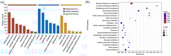 KEGG enrichment analysis was also carried out on the DEGs of S. cerevisiae under 4% lactic acid stress. The up-DEGs were primarily enriched in the yeast MAPK signaling pathway, peroxisome, and biosynthesis of cofactor pathways (Figure 6a), suggesting that these metabolic pathways may be key mechanisms for lactic acid tolerance in the S. cerevisiae NCUF309.5-44. In contrast, the down-DEGs were mainly enriched in pathways related to the ribosome, ribosome biogenesis in eukaryotic, and RNA polymerase (Figure 6b). The KEGG enrichment analysis indicated that acclimating to lactic acid stress involves a complex interplay of various cellular pathways, with some pathways being upregulated to cope with the stress and others being downregulated, potentially as a way to reallocate cellular resources or to reduce energy-consuming processes.