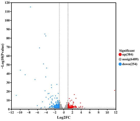 To further explore the lactic acid tolerance mechanism of the S. cerevisiae NCUF309.5-44, quantitative analysis of gene expression levels was conducted utilizing expression quantification software RSEM 1.3.3. The differential expression levels of genes between samples were calculated, and the number of DEGs was analyzed using the screening criteria of fold change (FC) ≥ 2 or ≤0.05 and p < 0.05 under 4% lactic acid concentrations. As shown in Figure 5, the lactic acid-tolerant strain exhibited 384 genes significantly upregulated and 254 genes significantly downregulated compared to the original strain under 4% lactic acid stress, indicating that there were differences in the biological metabolic reactions and regulatory mechanisms between the two strains under lactic acid stress. These differences in gene expression might contribute to the enhanced tolerance of S. cerevisiae NCUF309.5-44 to lactic acid.