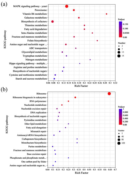 The results of KEGG enrichment analysis of DEGs between original and lactic acid-tolerant strains under lactic acid stress ((a): up-DEGs; (b): down-DEGs).
