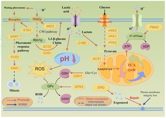 Currently, the literature on the potential mechanisms of yeast tolerance to acid stress mainly focuses on biomass conversion and the industrial production of organic acids. Zeng et al. [5] reported that yeast could enhance its formic acid tolerance and achieve self-protection during lignocellulosic conversion by slowing the synthesis of certain amino acids and nucleotides and reducing energy consumption. On the other hand, Ribeiro et al. [6] found that yeast could alter the structure of the cell wall to increase its hardness, thereby improving its tolerance to acetic acid stress. In addition, the simultaneous activation of biotransformation, stress response, and transmembrane transport, along with the transcription factors Haa1p, Hap4p, Yox1p, and Mag1p to enhance formic and acetic acid tolerance in yeast cells, was also observed [7]. Additionally, Hakkaart et al. [8] also revealed the detrimental effects of low pH on yeast strains used in industrial applications, including increased energy maintenance requirements and a rise in mortality rates. However, these studies primarily focused on the tolerance mechanisms of engineered and wild strains to acid stress in industrial production, and there is still a relative lack of research on gene mutant strains that could tolerate high concentrations of acid stress. More critically, this research direction will lay the foundation for future research on lactic acid tolerance in yeast strains and directly benefit the Chinese traditional Baijiu production industry.