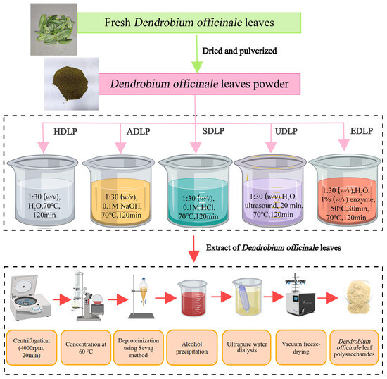 Flowchart for the preparation of Dendrobium officinale leaf polysaccharides extracted using different methods.