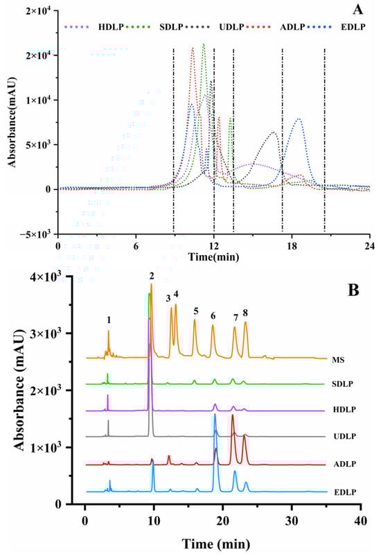 The monosaccharide composition of DLPs obtained through the various extraction methods is summarized in Table 1. It is evident that different extraction methods yield varying predominant monosaccharide units and differing proportions (Figure 2B). Consistent with the previous research findings [5,30], mannose (83.72 ± 0.90%) was identified as the predominant monosaccharide in HDLP, followed by galacturonic acid (9.83 ± 0.40%). In comparison to HDLP, UDLP exhibited a nearly identical monosaccharide composition. This observation suggests that ultrasonic-assisted extraction does not significantly impact the type of monosaccharides present in DLPs but alters their proportions. Similar results have been reported in the comparison of hot water and ultrasound-assisted extraction for Choerospondias axillaris peel polysaccharides [37]. Additionally, a similar monosaccharide composition was also observed in SDLP; however, it exhibited a lower concentration of mannose and a higher concentration of glucuronic acid (Table 1). The increase in glucuronic acid may be attributed to the acid solution facilitating the hydrolysis of glycosidic bonds, while inhibiting the degradation of uronic acid [38]. In contrast, ADLP and EDLP demonstrated distinct monosaccharide compositions. Specifically, the major monosaccharides in ADLP were identified as glucose (41.93 ± 0.32%), galactose (28.94 ± 0.26%), and galacturonic acid (18.21 ± 0.03%), indicating that the alkali solution markedly hydrolyzes the polysaccharide chains and disrupts the hydrogen bonds between molecules [39]. Furthermore, galacturonic acid (71.37 ± 0.17%) was found to be the predominant monosaccharide of EDLP, followed by mannose and galactose. Enzymes have the potential to convert insoluble cellular carbohydrates into soluble forms, thereby altering the monosaccharide composition of the polysaccharides [18].