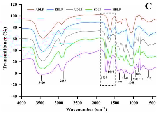 FT-IR is widely acknowledged as an effective technique for analyzing the functional groups in chemical structures. Figure 2C shows the FT-IR spectra of five distinct DLPs in the range of 4000~400 cm−1. The peaks at 3420 cm−1 and 2887 cm−1 are attributed to the stretching vibrations of hydroxyl (O-H) and carbon-hydrogen (C-H) bonds, respectively. Notably, no significant variations in these peaks were detected in the spectra of the five DLPs obtained through different extraction methods. The peak, around approximately 1737 cm−1, corresponds to the C=O vibration, which was prominently observed in HDLP, SDLP, and UDLP, but exhibited a weaker presence in EDLP. Conversely, this peak was absent in the spectrum of ADLP. Such discrepancies suggest that the extraction techniques employed may affect the stretching of esterified carboxylate groups. The absence of this peak implies that alkaline conditions likely induced a de-esterification effect on the DLPs [40]. The peak at 1644 cm−1 is indicative of the asymmetric bending vibration of a C=O group, suggesting the presence of uronic acids [41]. This peak can be observed in all five DLPs, indicating that uronic acid is present in all DLPs. Furthermore, the bands around 1247 cm−1 are characteristic of the symmetric C-O-S stretching vibrations, with a notable reduction in absorption observed in ADLP and EDLP. The pronounced bands between 1200 cm−1 and 1000 cm−1 result from the overlapping ring vibrations and the stretching vibrations of C-O-H side groups, as well as the C-O-C glycosidic bond vibrations, suggesting the potential presence of pyranose in the DLPs [16,42]. The distinctive absorption peak at 960 cm−1 confirms that β-type glycosidic bonding is the predominant bond type in DLPs, while the characteristic absorption peaks at 875 cm−1 and 810 cm−1 are attributed to the possible presence of D-glucopyranose and α-D-mannopyranose, respectively [16].