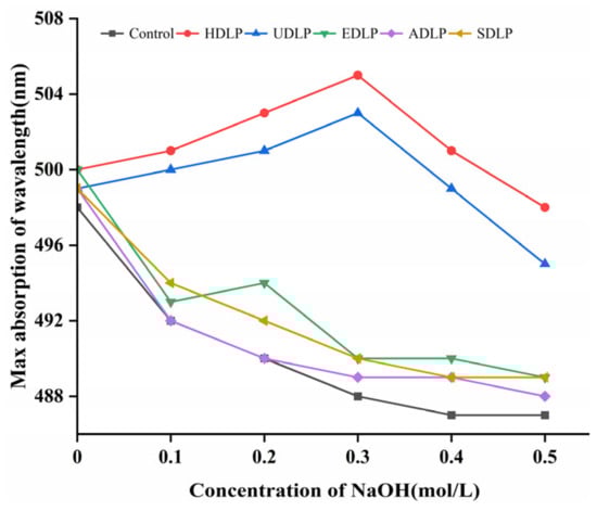 The identification of the triple helical structure of polysaccharide is often achieved through the Congo red test, which facilitates the formation of a complex between Congo red and polysaccharides exhibiting a triple helix configuration. This interaction results in a red shift in the maximum absorption wavelength of the solution [43]. As shown in Figure 3, only HDLP and UDLP produced a significant red shift in the maximum absorption wavelength of the Congo red solution, whereas other DLPs did not demonstrate this phenomenon. This observation suggests that only HDLP and UDLP possess a triple helix conformation, consistent with the findings reported by Geng et al. [22]. The stability of the triple helix structure in polysaccharide solutions depends on the presence of intramolecular and intermolecular hydrogen bonds, which can be influenced by different extraction methods [43]. The results of this study indicate that acid-, alkali-, and cellulase-assisted extraction compromise the structural integrity of the triple helix configuration in DLPs.