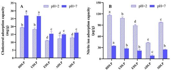 The combination of bile acids and polysaccharides has been shown to enhance the excretion of bile acids and promote cholesterol metabolism, thereby contributing to a reduction in total cholesterol levels and the risk of cardiovascular diseases. As illustrated in Figure 5A, all five DLPs demonstrated superior adsorption capacity in a neutral environment (pH 7) compared to an acidic environment (pH 2). These results indicate that DLPs are more effective at adsorbing cholesterol in the intestinal tract. Furthermore, DLPs exhibited a significantly greater ability to absorb nitrite at pH 2 (Figure 5B), which contrasts with their adsorption behavior for cholesterol. This finding suggests that the stomach environment is more favorable for DLPs to adsorb NO2−, consistent with the previous reports [25]. Among all the samples tested, HDLP exhibited the highest nitrite adsorption capacity, followed by UDLP, SDLP, EDLP, and ADLP under both pH conditions. Notably, HDLP and UDLP demonstrated significantly higher adsorption effects for both cholesterol and nitrite compared to the other three DLPs under the test conditions (p < 0.05), which may be attributed to their structural characteristics.